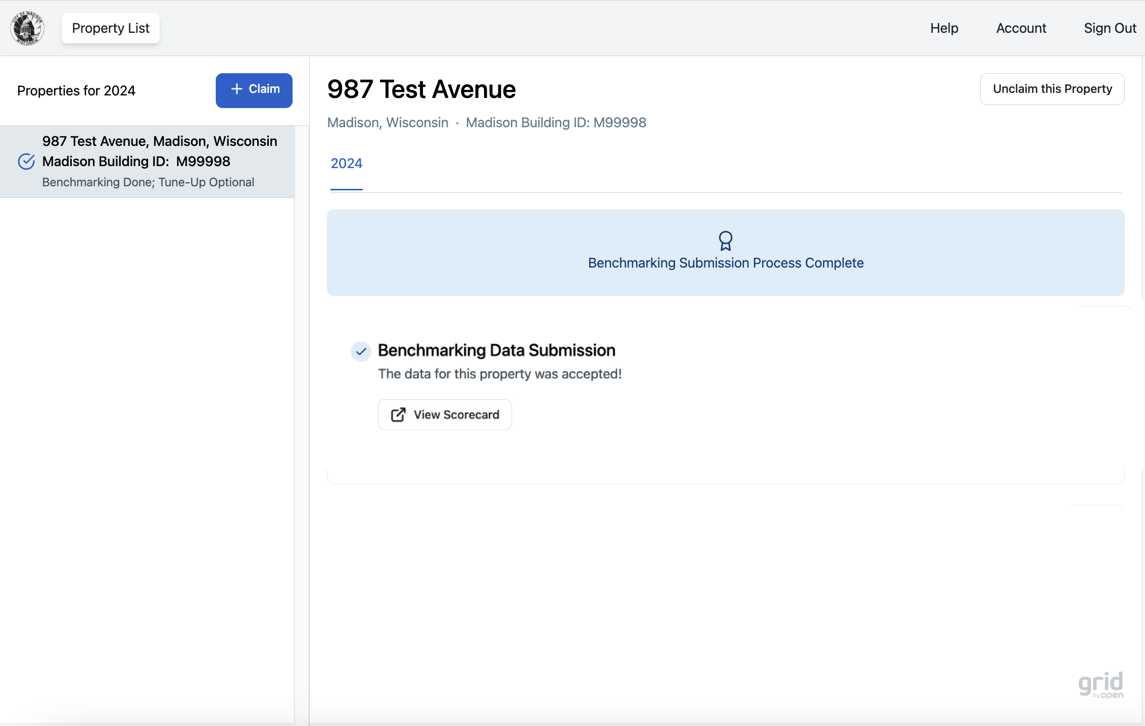 When your scorecard is ready, the View Scorecard button will appear in the Building Owner Portal. Click View Scorecard to review your Building Performance Scorecard (please note, initial loading can take up to 30 seconds).